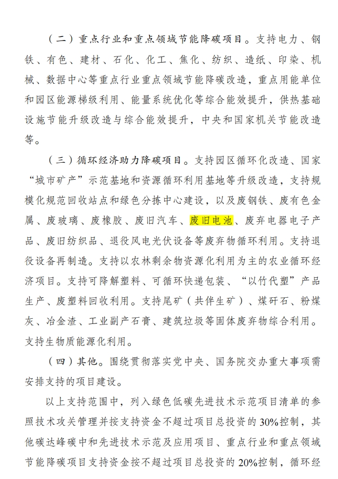 《節(jié)能降碳中央預(yù)算內(nèi)投資專項(xiàng)管理辦法》該管理辦法明確了其支持的主要領(lǐng)域,包括碳達(dá)峰碳中和先進(jìn)技術(shù)示范及應(yīng)用項(xiàng)目、重點(diǎn)行業(yè)和重點(diǎn)領(lǐng)域節(jié)能降碳項(xiàng)目,以及循環(huán)經(jīng)濟(jì)助力降碳項(xiàng)目等。在資金補(bǔ)助標(biāo)準(zhǔn)方面,該辦法規(guī)定對(duì)于列入綠色低碳先進(jìn)技術(shù)示范項(xiàng)目清單的項(xiàng)目,支持資金不超過(guò)項(xiàng)目總投資的30%;對(duì)于其他碳達(dá)峰碳中和先進(jìn)技術(shù)示范及應(yīng)用項(xiàng)目、重點(diǎn)行業(yè)和重點(diǎn)領(lǐng)域節(jié)能降碳項(xiàng)目,支持資金按不超過(guò)項(xiàng)目總投資的20%控制;而循環(huán)經(jīng)濟(jì)助力降碳項(xiàng)目的支持資金則按不超過(guò)項(xiàng)目總投資的15%控制。這一政策導(dǎo)向,無(wú)疑為廢舊電池回收處理再利用行業(yè)提供了強(qiáng)有力的支持。